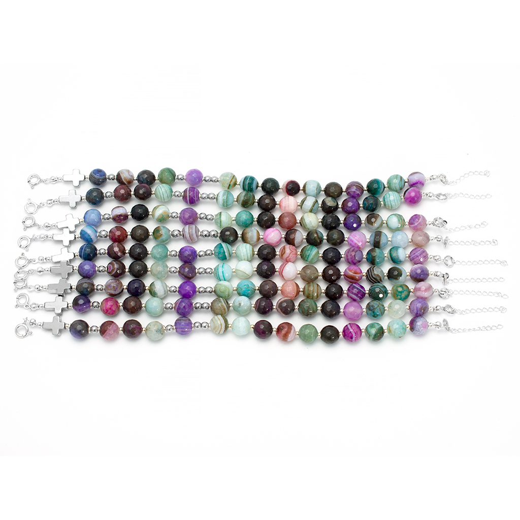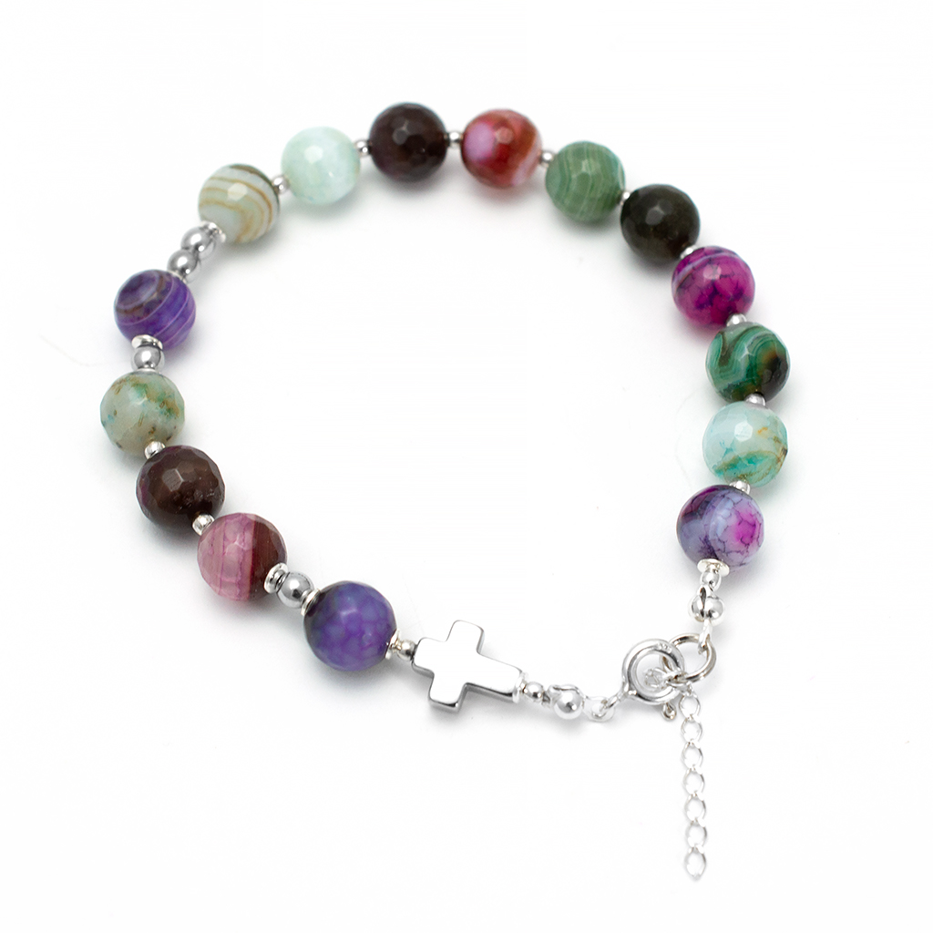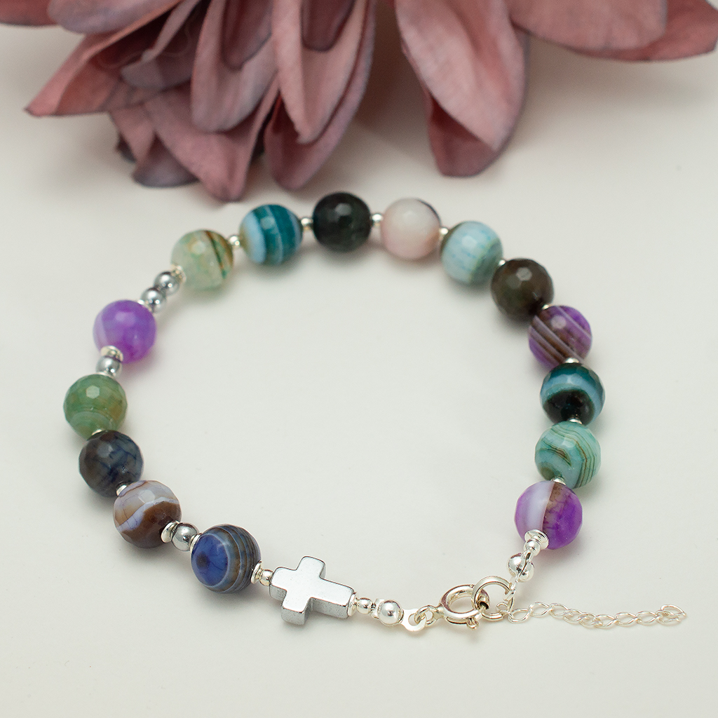 Nasza dziesiątka różańca w formie bransoletki to coś więcej niż biżuteria. To osobisty symbol, który towarzyszy Ci w każdym momencie dnia. Wykonaliśmy ją ręcznie w naszej polskiej pracowni z fasetowanego agatu i srebrzonego hematytu.