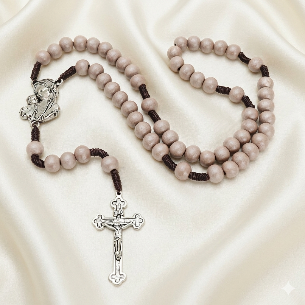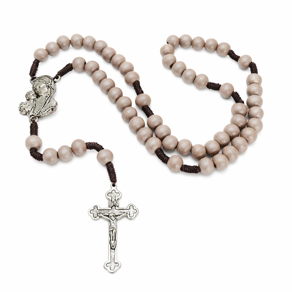 Piękny, duży różaniec z drewnianych koralików w kolorze perłowym beżowym. Różaniec jest bardzo lekki. Pleciony ze sznurka w kolorze brązowym. Pomiędzy dziesiątkami są kunsztownie wykonane supełki.