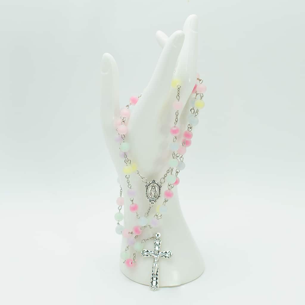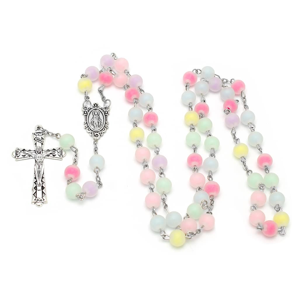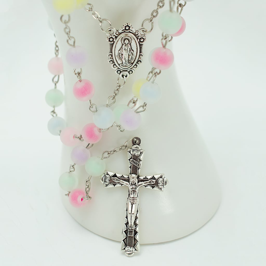 Różaniec z wielobarwnych koralików z żywicy w pięknych, pastelowych kolorach. Koraliki są matowe. Zapakowany w pudełeczko.