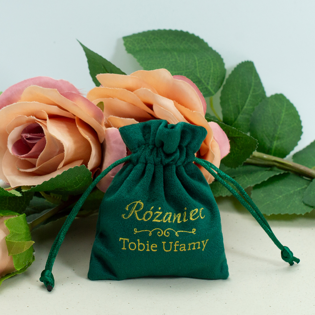 Gotowy na prezent: Różaniec wysyłamy w welurowym woreczku, które zapewnia bezpieczne przechowywanie i stanowi pomysł na piękny prezent na Chrzest, Komunię, Bierzmowanie, oraz inne uroczystości.