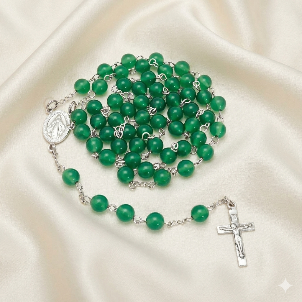 Klasyczny, zielony różaniec z naturalnego agatu w kolorze pięknej, soczystej zieleni. Wykonany ze srebra próby 925. Zapakowany w woreczek welurowy z naszym logo.