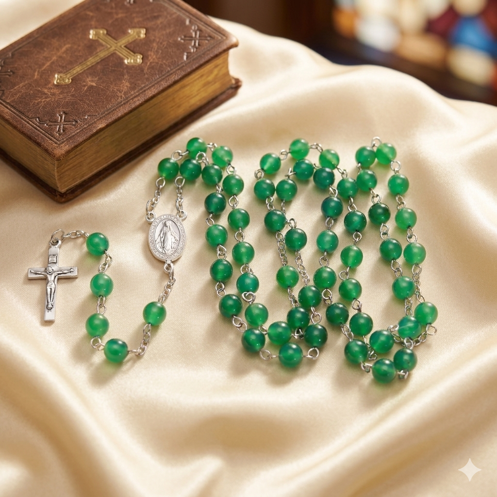 Szlachetne materiały – do jego wykonania użyliśmy naturalnego agatu oraz srebra próby 925. Centralnym punktem różańca jest klasyczny krzyżyk z wizerunkiem Chrystusa oraz Cudowny Medalik (Medalik Niepokalanego Poczęcia), symbolizujący szczególną opiekę i łaskę.