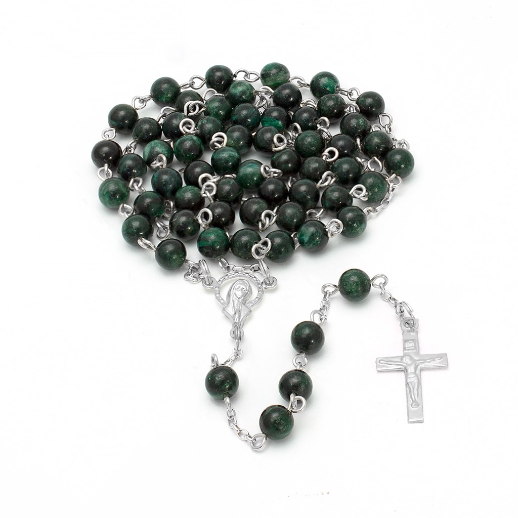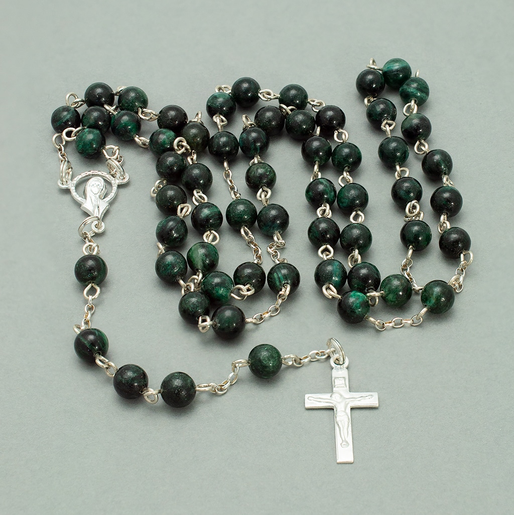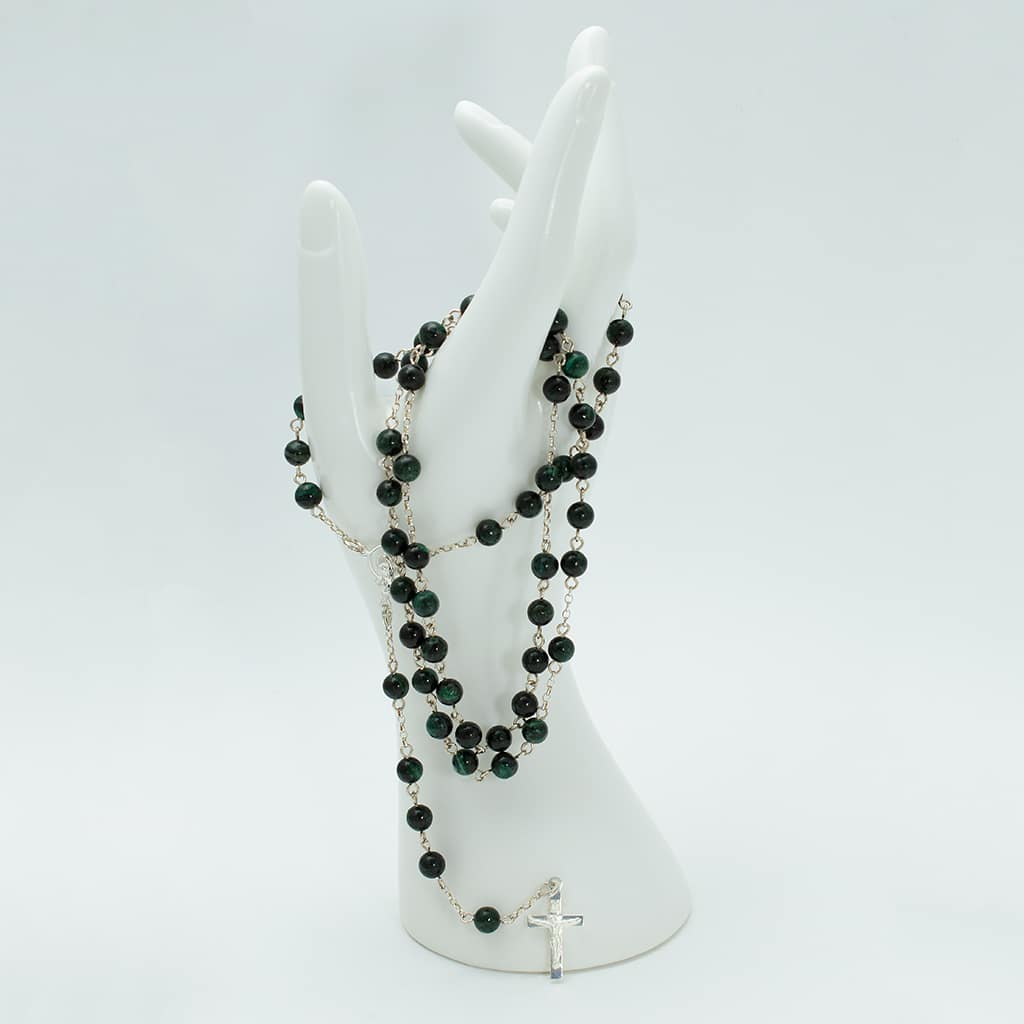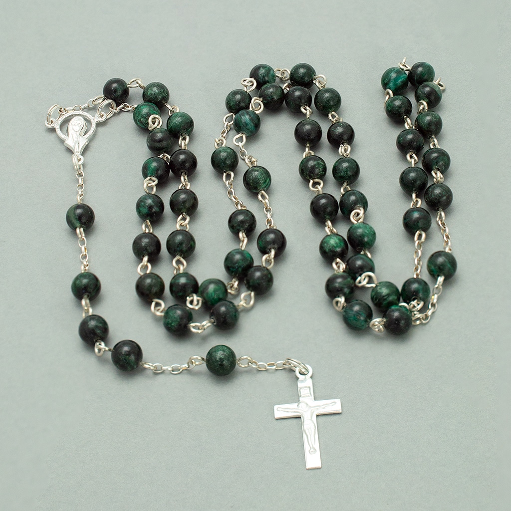 Ten ponadczasowy różaniec to piękna pamiątka rodzinna, która przetrwa pokolenia. Wykonany wyłącznie z elementów naturalnych – kamieni szlachetnych – naturalnego szmaragdu w kolorze ciemnej, głębokiej zieleni i srebra próby 925.