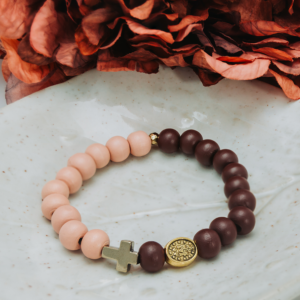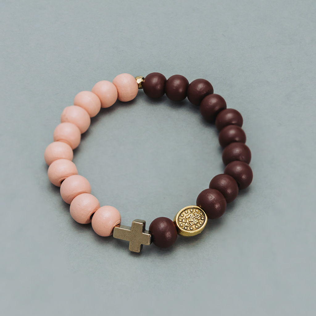 Różowo brązowa bransoletka z krzyżykiem / różaniec na rękę z drewna