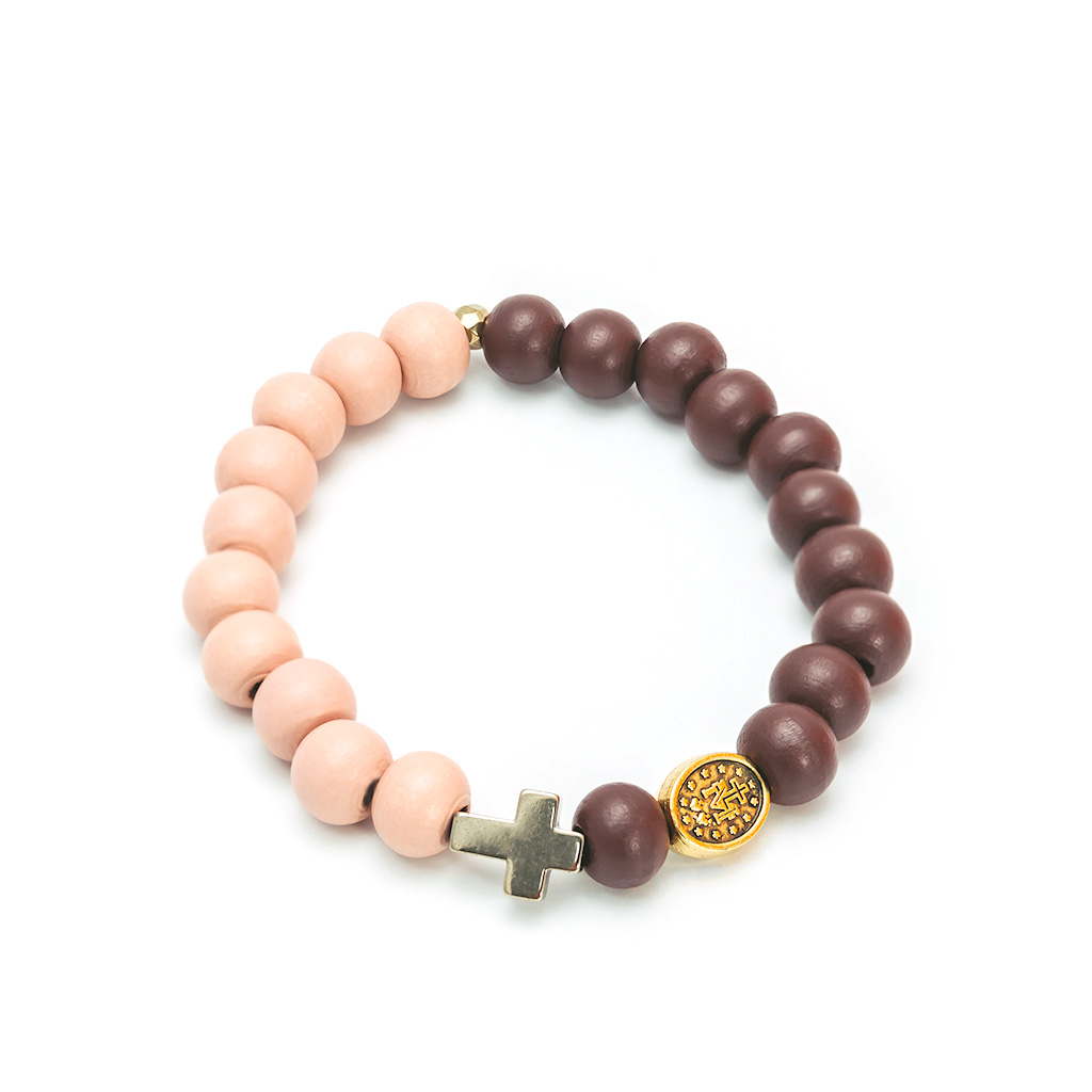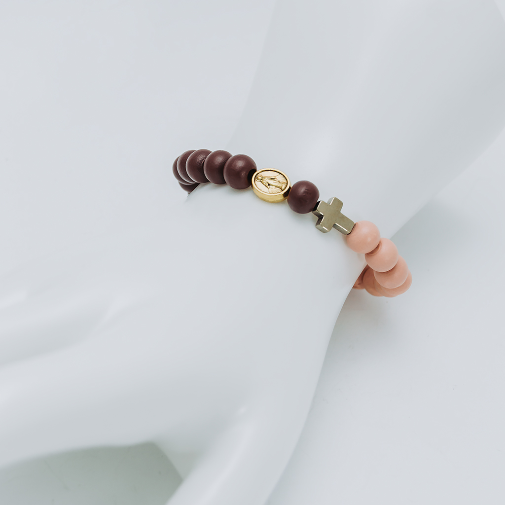 • Ta piękna bransoletka – różaniec została wykonana z drewnianych koralików w dwóch kolorach (brązowy i pudrowy róż), złoconego hematytu i medalika z wizerunkiem Matki Boskiej w kolorze złotym.