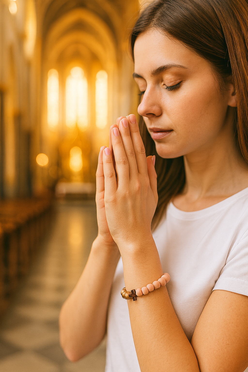 Różowo złota bransoletka z krzyżykiem / różaniec na rękę z drewna