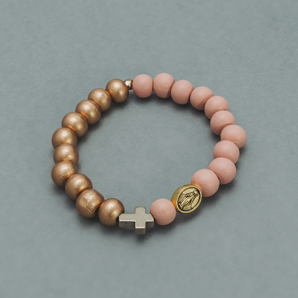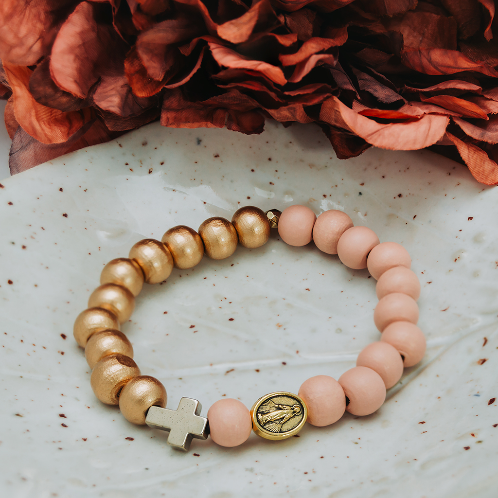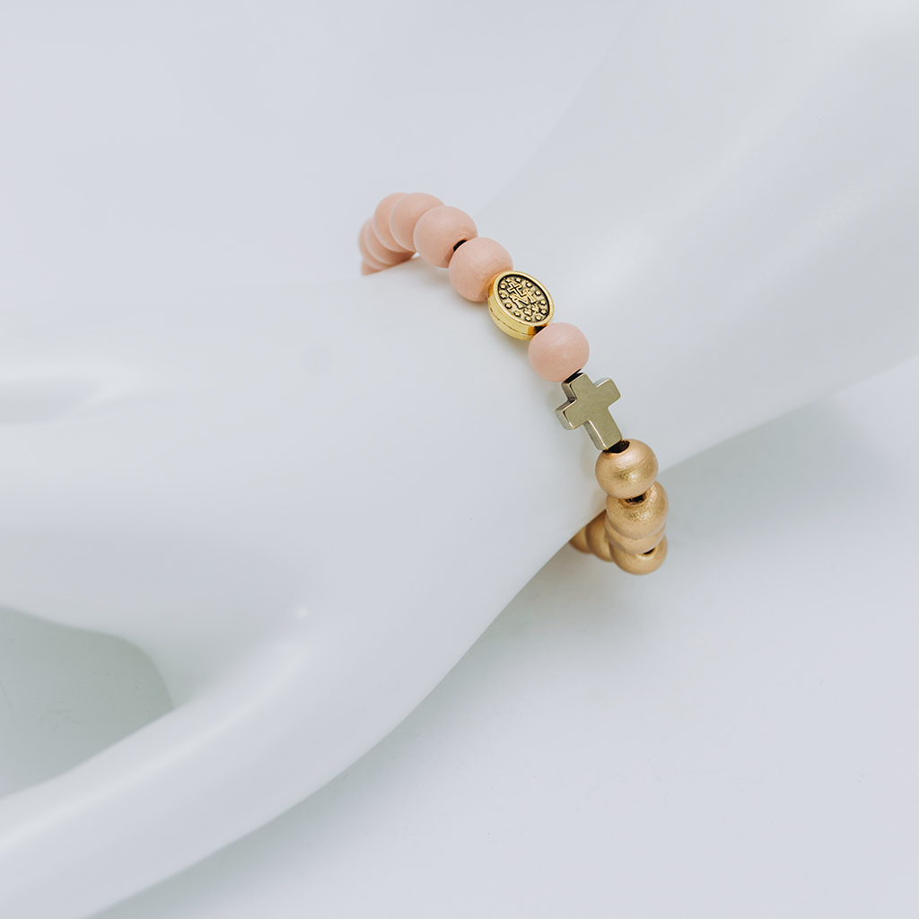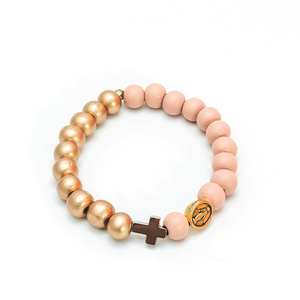 • Ta piękna bransoletka – różaniec została wykonana z drewnianych koralików w dwóch kolorach (pudrowy róż i złoty), złoconego hematytu i medalika z wizerunkiem Matki Boskiej w kolorze złotym.