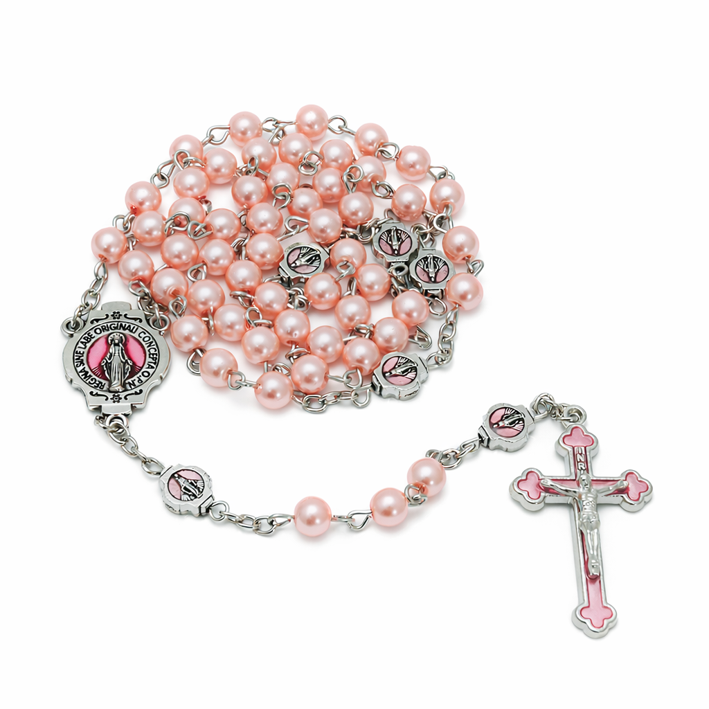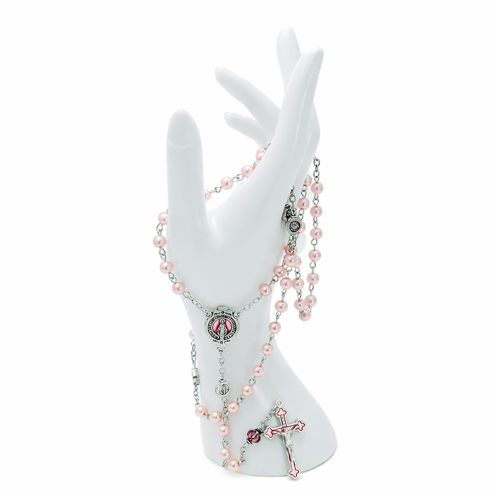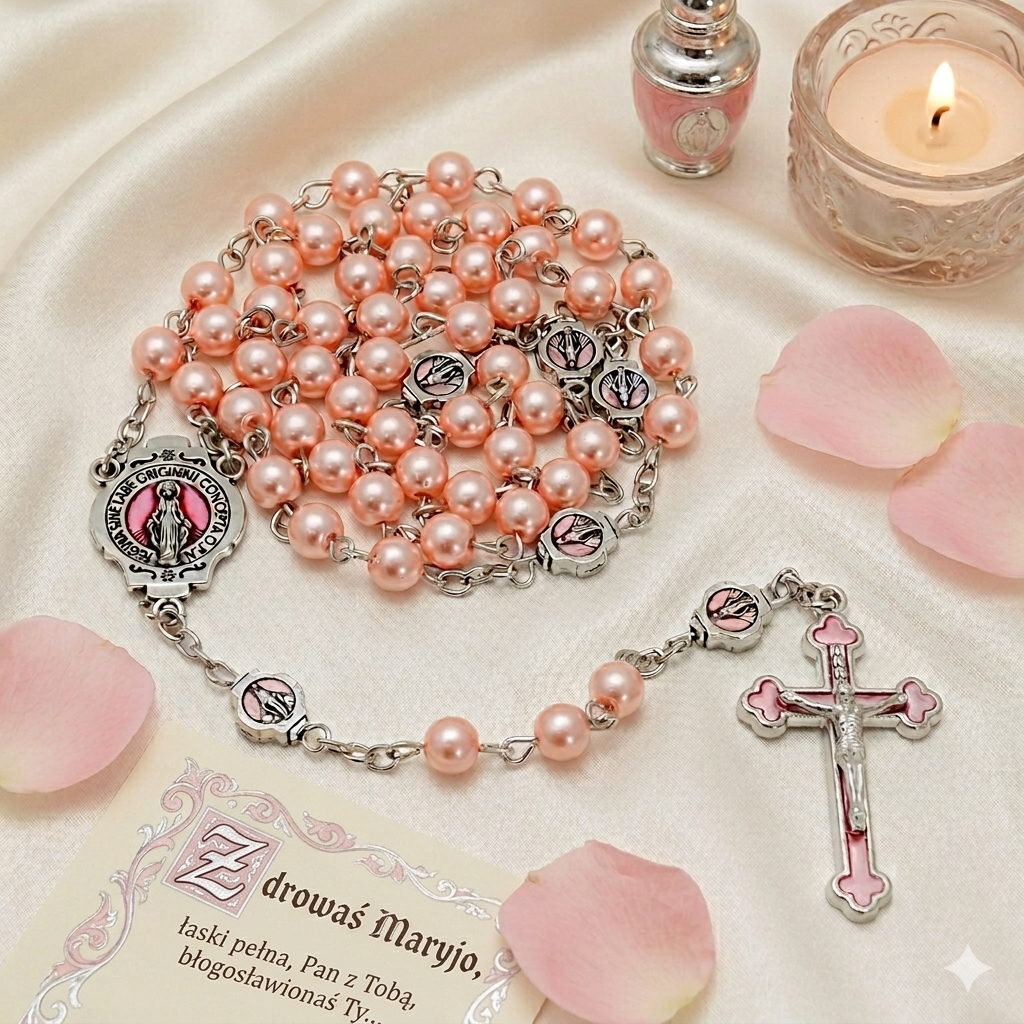 Piękny, elegancki, różowy różaniec dla kobiet, dla dziewczynki. Wykonany z perełek w kolorze pudrowego różu. Łącznik i krzyżyk ozdobione różową emalią.