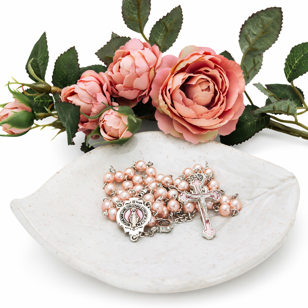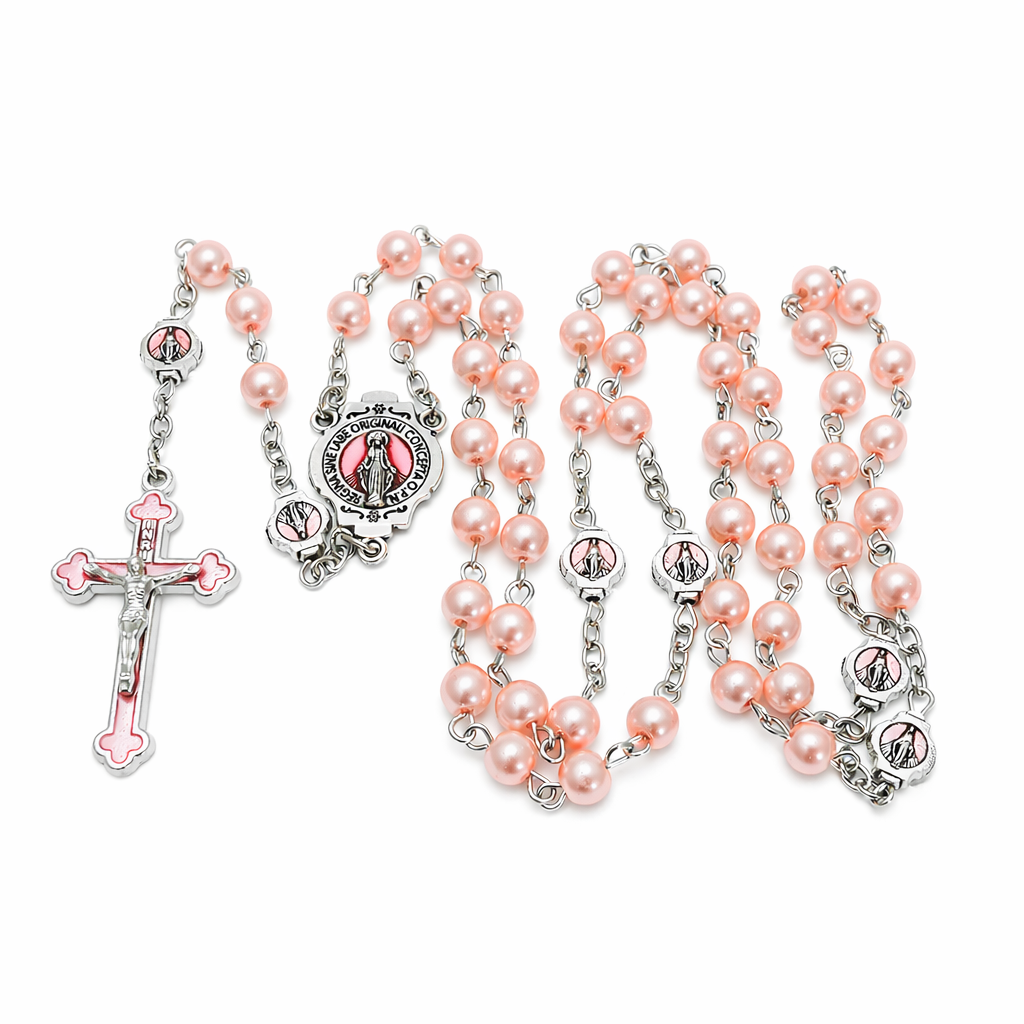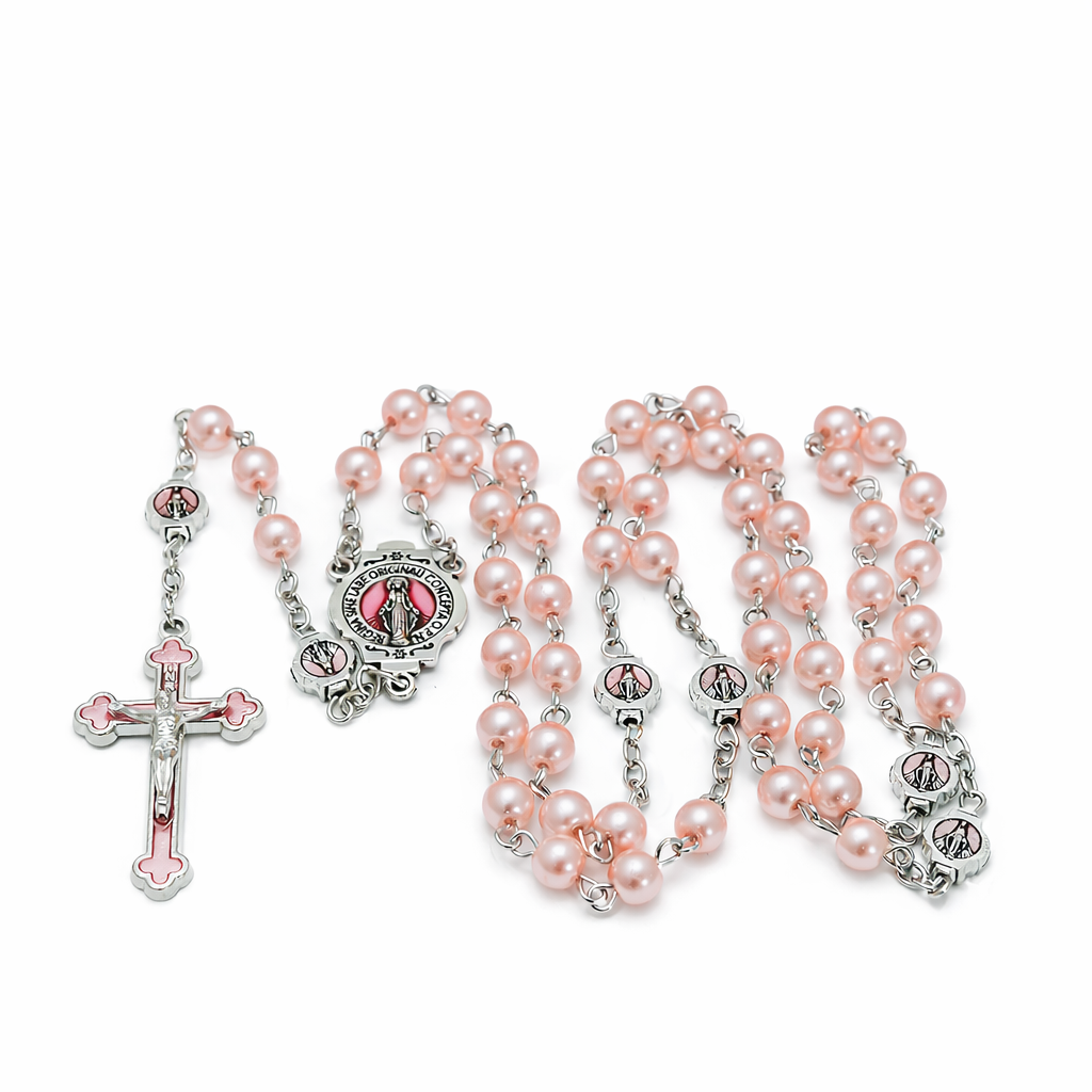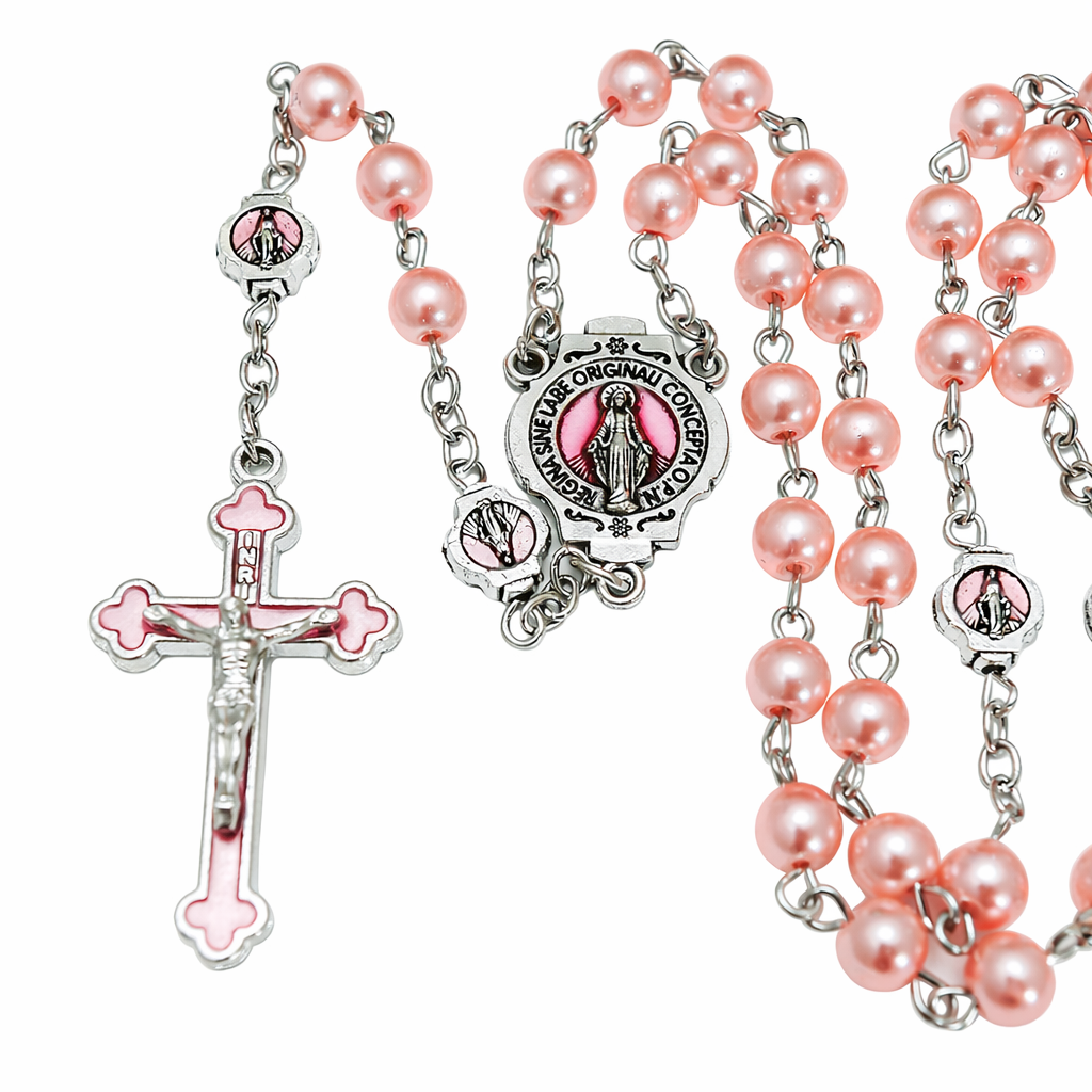 Piękny, elegancki, różowy różaniec dla kobiet, dla dziewczynki. Wykonany z perełek w kolorze pudrowego różu. Łącznik i krzyżyk ozdobione różową emalią.